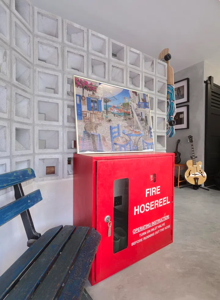 The repurposed real fire hydrant was in Mike and Grace’s previous home. Used to store rubbish, in their new home, it now acts as their shoe rack and storage.