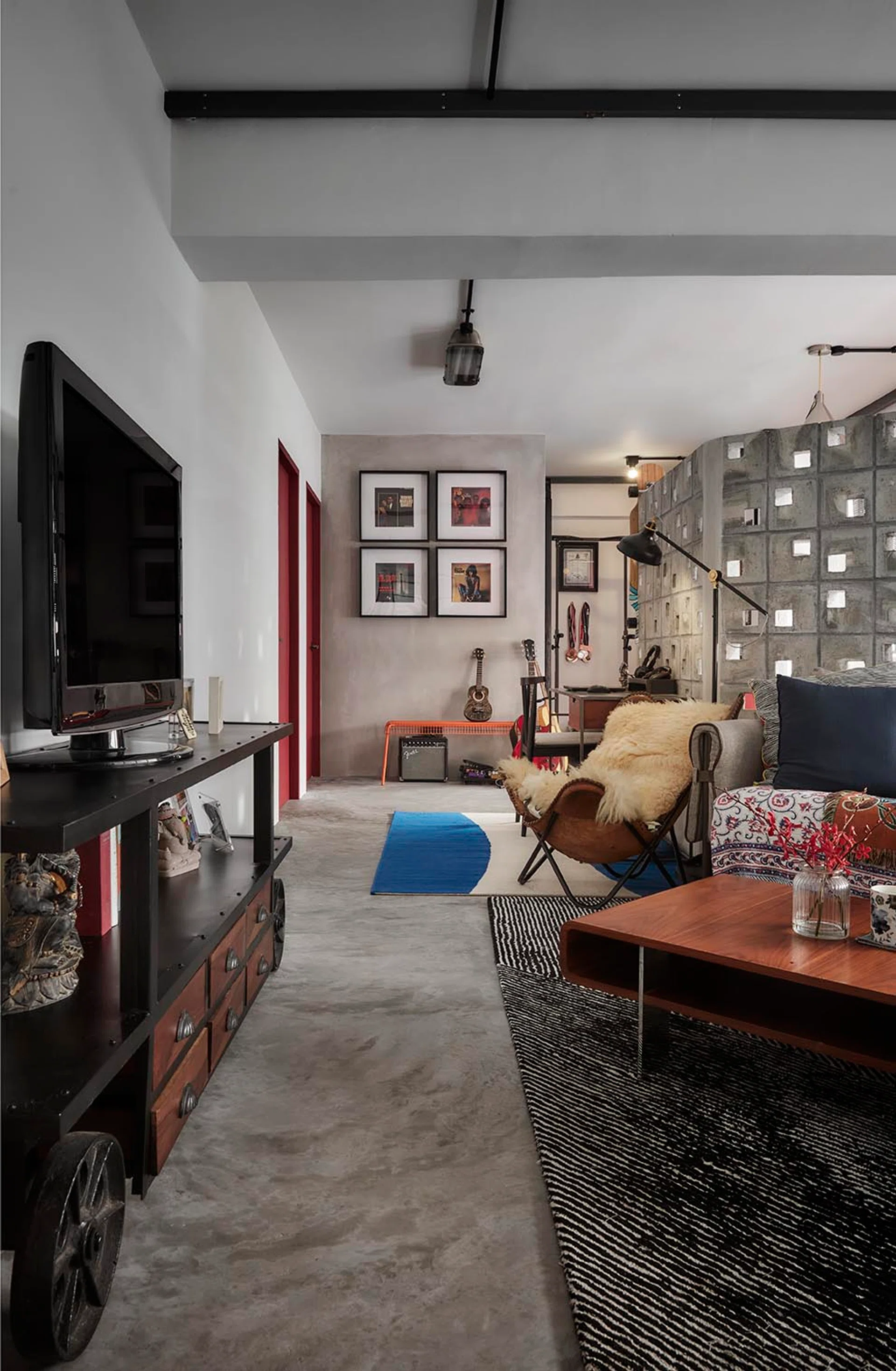 Doorways and frames boast a dramatic apple red colour, balanced with the cool materials like cement.