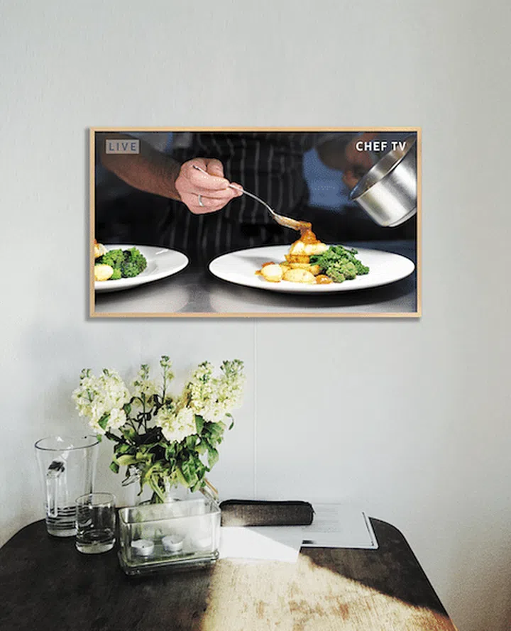 The bezel of the TV can be changed easily as it is attached magnetically. Choose from walnut, beige wood, white or porcelain blue. This way, you can ensure your TV fits in seamlessly with the overall aesthetics of your home.