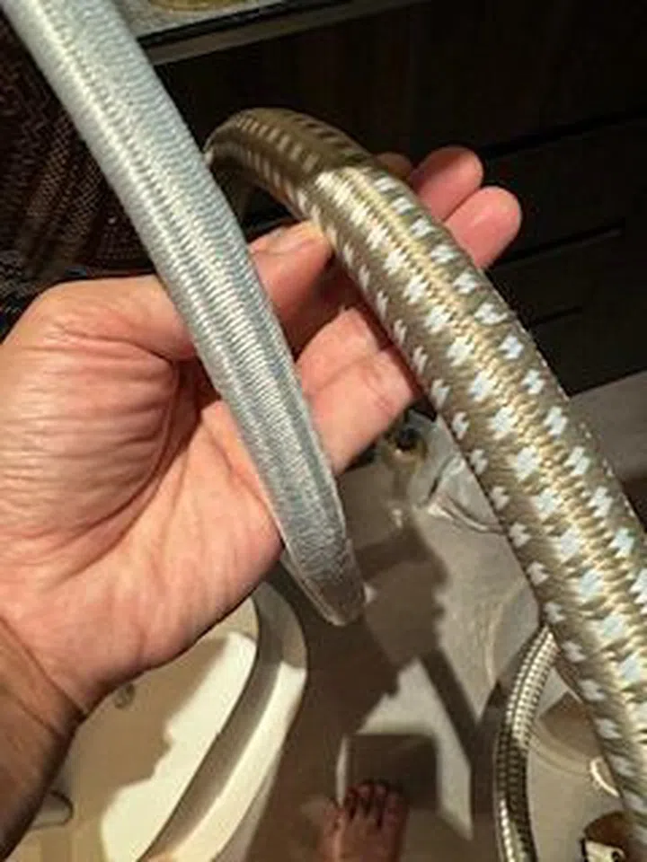 Comparing the size of the steam tube between my existing steamer (left) and the Xiaomi Mijia Garment Steam Iron (right). Notice how the Xiaomi Mijia version is also better insulated with the tightknit woven exterior.