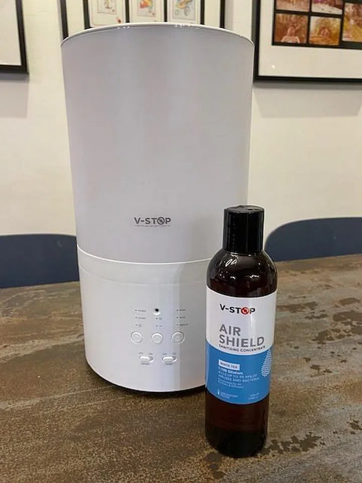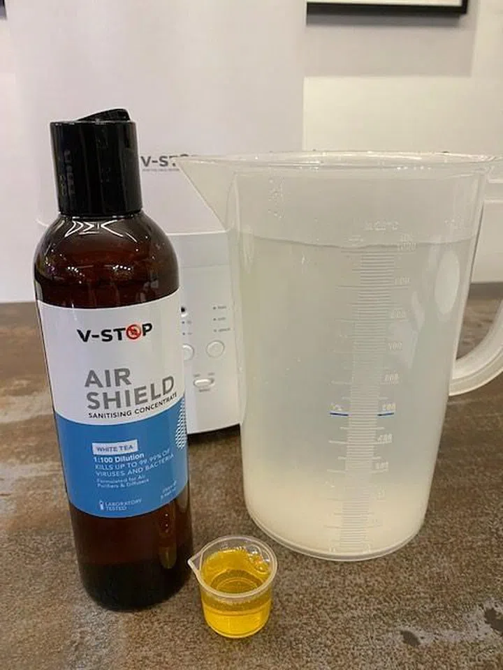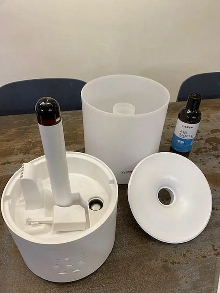 Aside from the diffuser itself, the winning formula to V-Stop's fight against bacteria lies in its Air Shield Concentrate solution. Now this is something new on the market, and very different from your usual essential oil diffuser mix. The solution is formulated using German Bioscience Technology. According to V-Stop, "Our active ingredient is a special amphoteric compound in an aqueous solution. It has been proven to provide a full spectrum of efficacy, safe handling, good biodegradability, and good compatibility with hard water and other surfactants." Active ingredients in the solution break down and penetrate the microbes’ cell walls, breaking down to eliminate the bacteria.